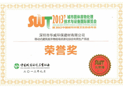 • 城市固體廢物處理技術與設備國際展覽會榮譽獎